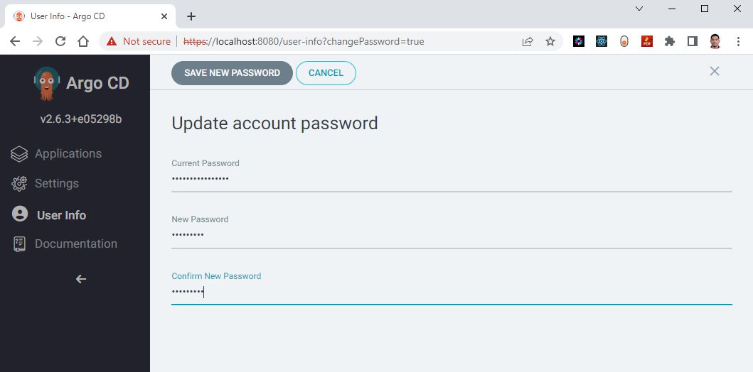 - Access the Argo CD web interface by visiting https://localhost:8080 in your web browser.